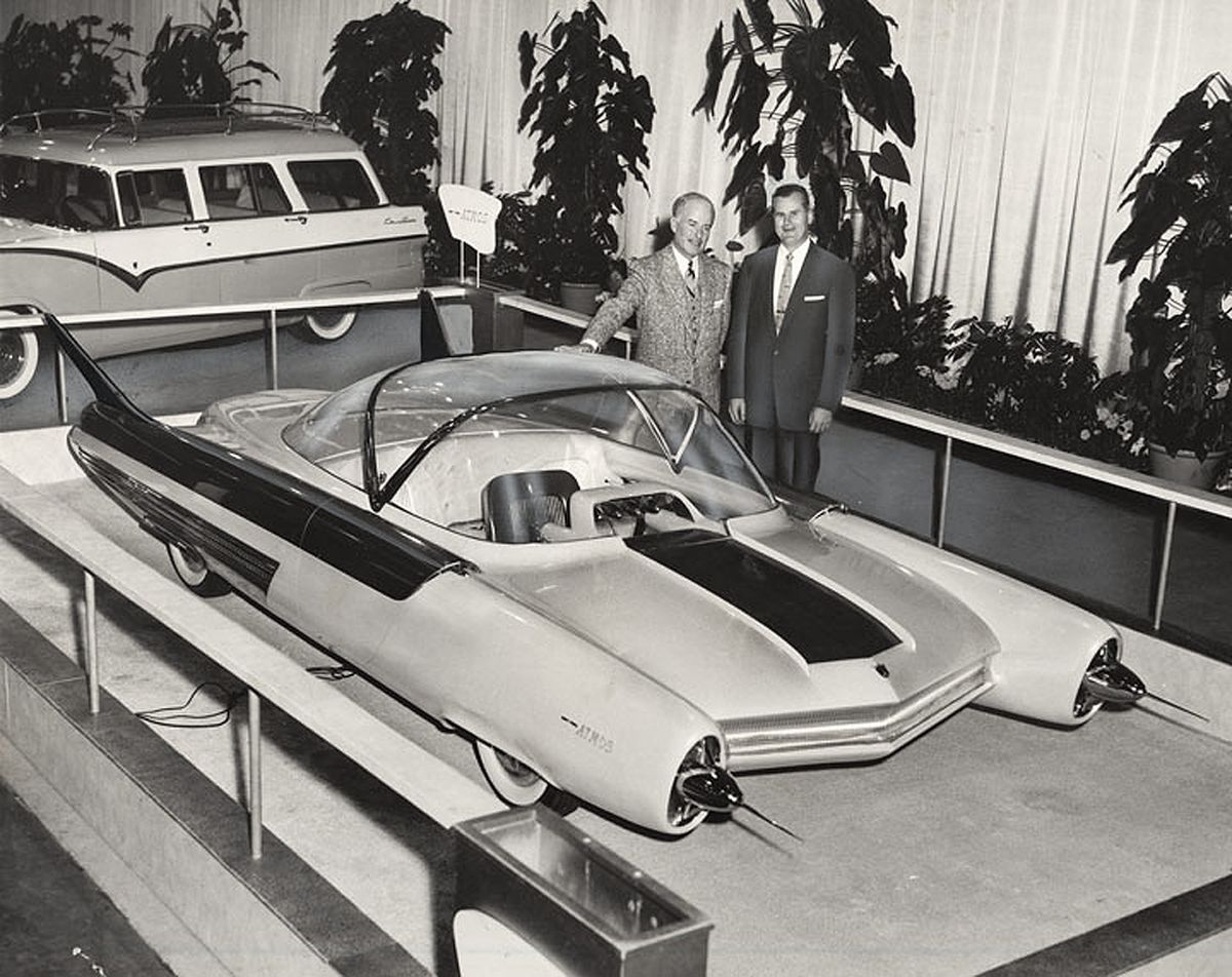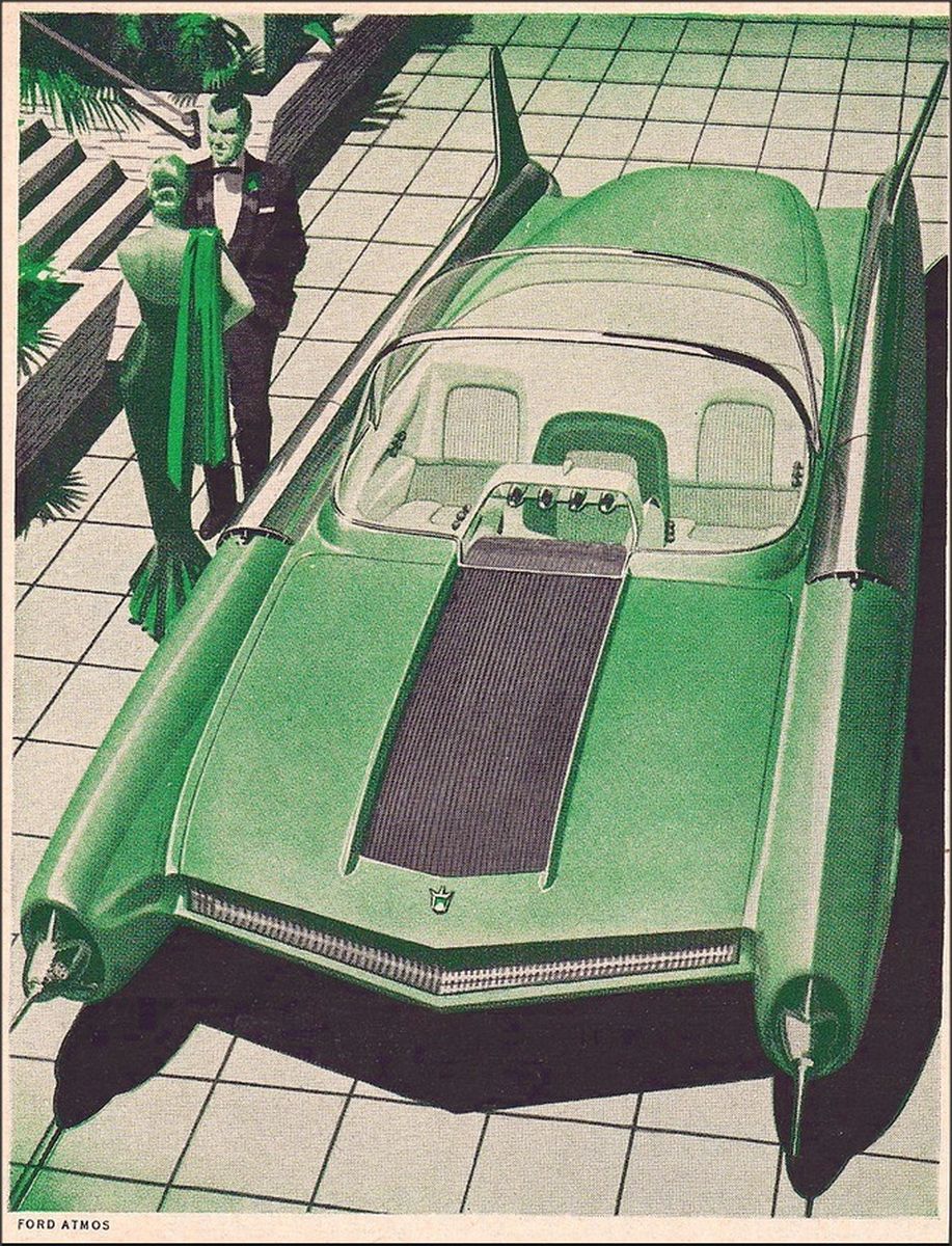 Los autos de ensueño de principios de la década de 1950 se inspiraron en gran medida en el estilo de los aviones a reacción, como el futurista Ford FX-Atmos. El FX-Atmos, que apareció en el Salón del Automóvil de Chicago de 1954, presentaba un techo abovedado de vidrio, aletas traseras, luces traseras de escape tipo cohete y antenas de radio en forma de aguja que sobresalían de los guardabarros delanteros. La cabina radical tenía un asiento del conductor montado en el centro y asientos traseros para 2 pasajeros. Los mangos dobles reemplazaron el volante normal y la pantalla de radar «Roadarscope» montada en el tablero proporcionaba información sobre la carretera.