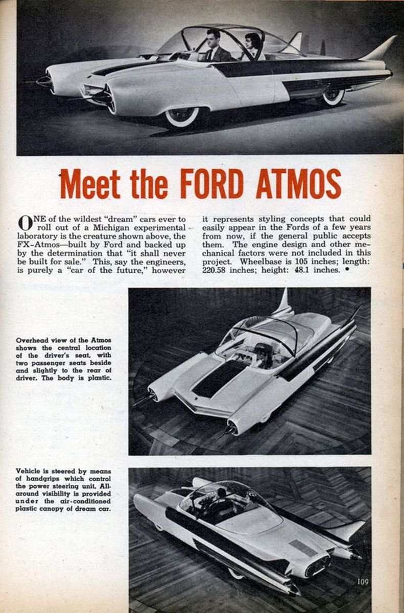 Este Ford futurista, el FX-Atmos, causó revuelo en el Salón del Automóvil de Chicago de 1954. Según el vicepresidente de Ford, su objetivo era «representar uno de los muchos caminos que el estilismo podría tomar en el futuro». El vehículo contenía diversos gadgets asociados a la aeronáutica, como una cabina panorámica, alerones en la parte trasera y dos frontales. Puntas afiladas, capaces de asustar a cualquier peatón.