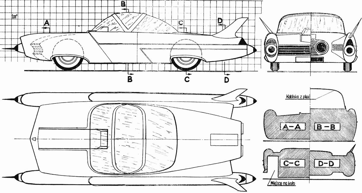 La impresionante pintura, de un blanco nacarado, estaba acentuada con metal brillante y cintas de rojo, azul y plata metálicos. No había volante. En cambio, el conductor operaba un par de palancas de control desde el asiento del piloto ubicado en el centro mientras miraba una pantalla de radar en el panel de instrumentos. Según Leon Dixon, autor del excelente Creative Industries of Detroit, la tapa de plástico de burbujas no era completamente funcional. Cuando los pasajeros posaron en la cabina para la fotografía de estudio, las secciones tuvieron que atornillarse en su lugar, atrapando a los modelos en el interior.