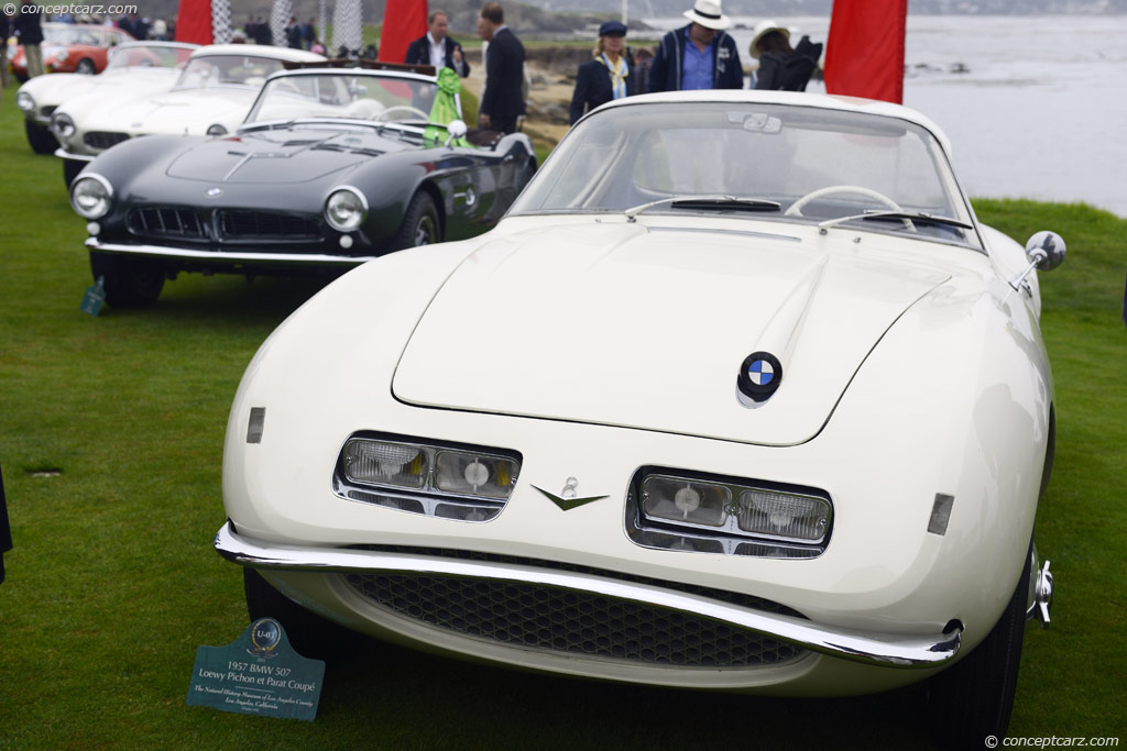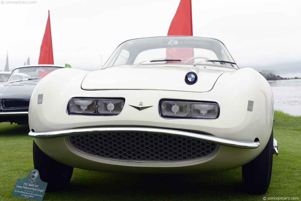 1957 BMW 507 Loewy Concept. Dos chasis BMW 507 fueron diseñados con trabajo de coachwork especial, y este ejemplo diseñado por Raymond Loewy fue el primero. Nacido en Francia, Loewy pasó la mayor parte de su carrera profesional en los Estados Unidos, donde, desde principios de los 1930 hasta finales de los 1950, su estilo de diseño racional floreció. Albrecht Graf von Goertz, el diseñador de la producción de 507, había sido enseñado por Loewy y los dos eran amigos íntimos.