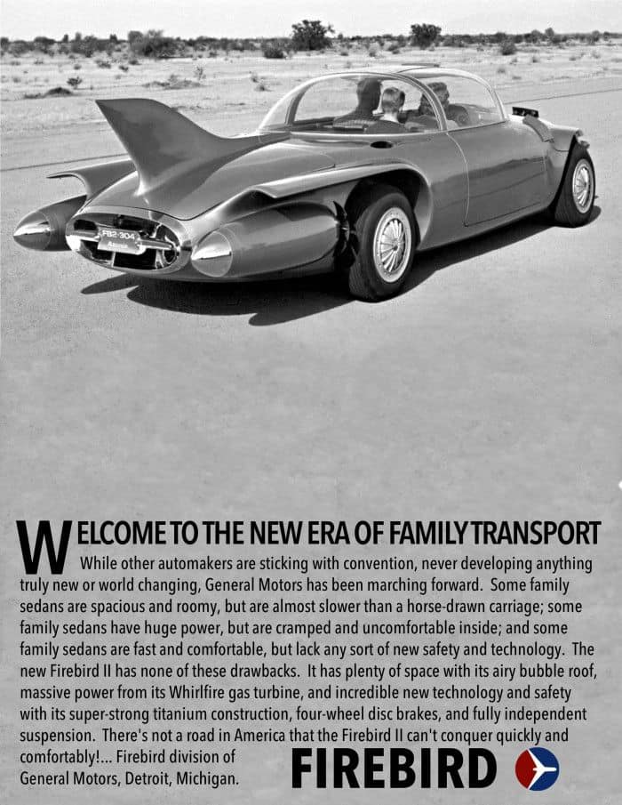 El primer Firebird, un automóvil de un solo asiento, presentado en el GM Motorama de 1954, fue el primer automóvil impulsado por turbina de gas construido y probado en los Estados Unidos. El Firebird II, un automóvil de cuatro pasajeros presentado en el Motorama de 1956, llevó adelante el progreso de la turbina de gas y presentó avances significativos en la comodidad de los pasajeros.