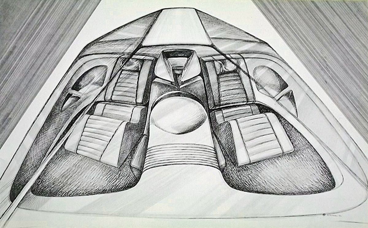 La parte trasera truncada que sigue el estilo de la época resalta la curiosa forma del habitáculo. Los tres asientos con el puesto de conducción ligeramente adelantado respecto a los demás. El diseño interior es glacial, retrofuturista con un objeto que hoy es normal pero que entonces era extraordinario: una pantalla en lugar del salpicadero.