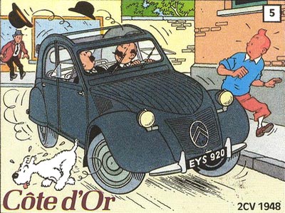 En algunas publicaciones, el equipo de Hergé diseñó promociones del Citroen 2CV con formato de fotografía. En realidad eran composiciones mixtas combinando fotos artísticas y dibujos basados en el estilo de Tintín.